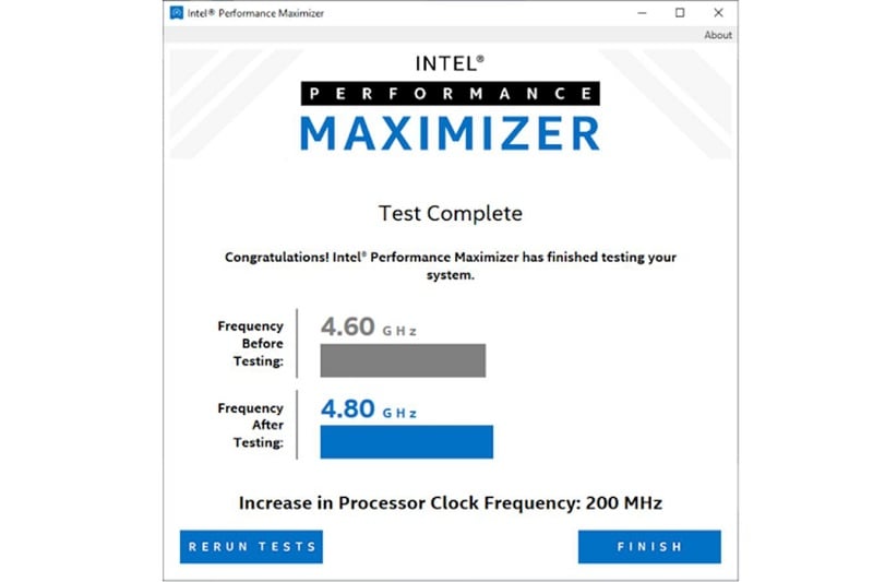 Sau hệ thống sẽ khởi động lại và Intel Performance Maximizer thông báo “test complete” lúc này máy tính đã chạy trên nền hiệu suất mới. Bạn sẽ thấy được bảng tóm tắt như hình dưới, trong ví dụ này là từ 4,6 GHz sau khi hoàn tất lên được 4,8 GHz.
