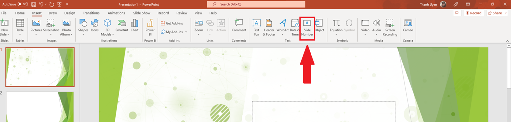 • Bước 2: Tại tab Text chọn Insert Slide Number.