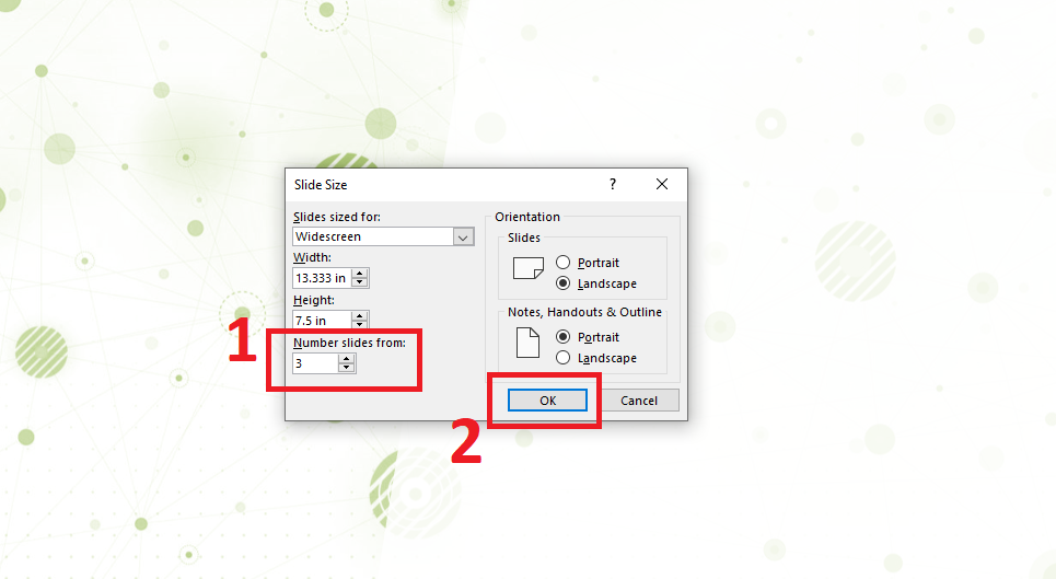 • Bước 3: Màn hình máy tính sẽ xuất hiện một cửa sổ Slide Size. Tại vị trí Number slides from: hãy nhập con số bạn muốn bắt đầu từ trang đầu tiên đó.