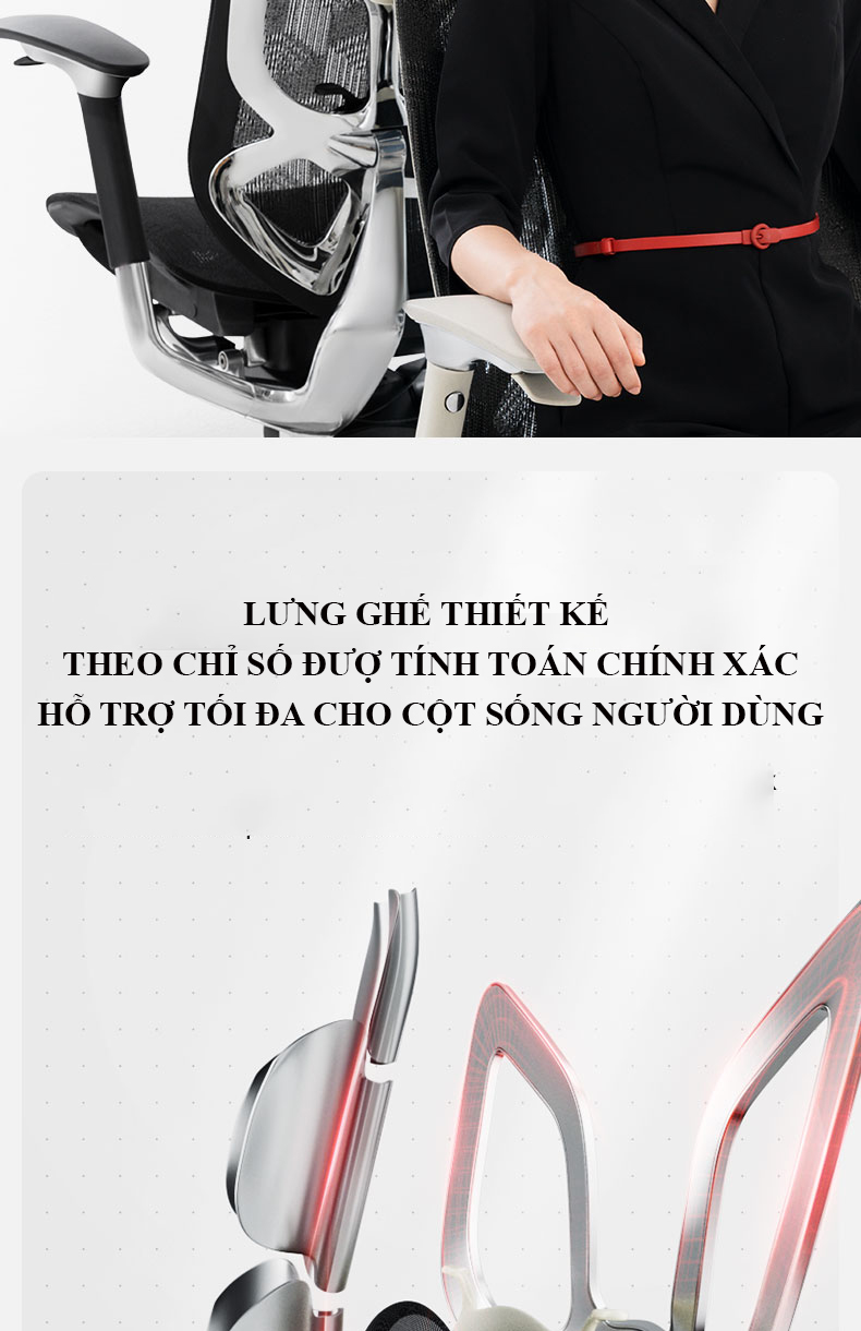 Tựa lưng : Thiết kế theo đường cong cột sống thêm đệm thắt lưng điều chỉnh hỗ trợ các vùng cột sống L1-L5