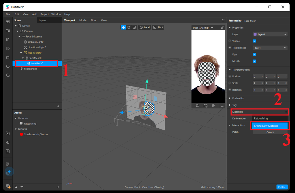 • Bước 10: Chọn vào faceMesh mới tạo, sau đó nhấn chọn Create New Material tại ô Materials ở bảng bên phải màn hình máy tính.